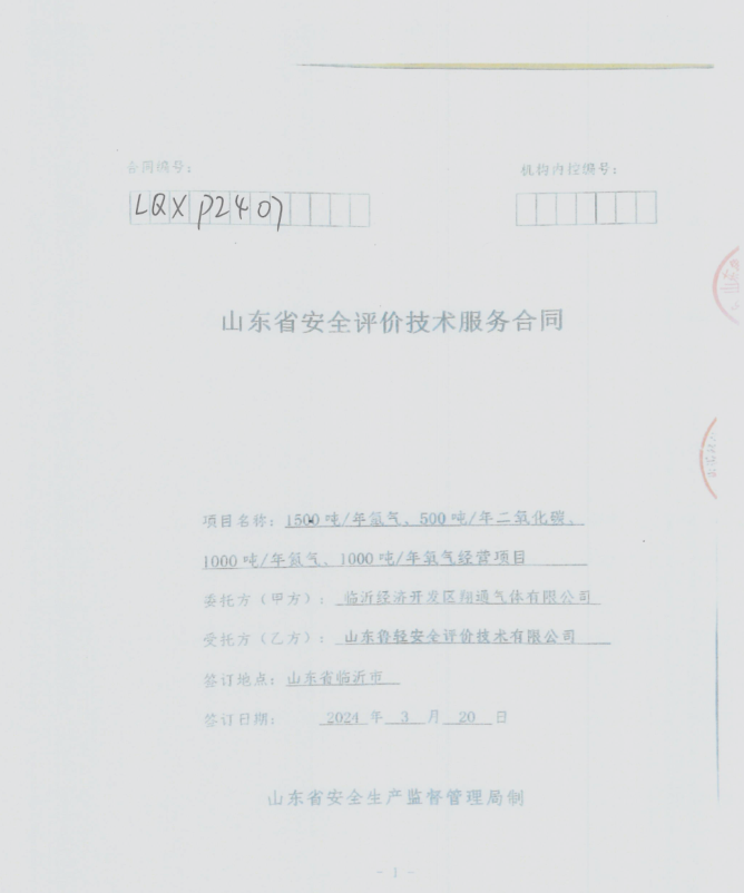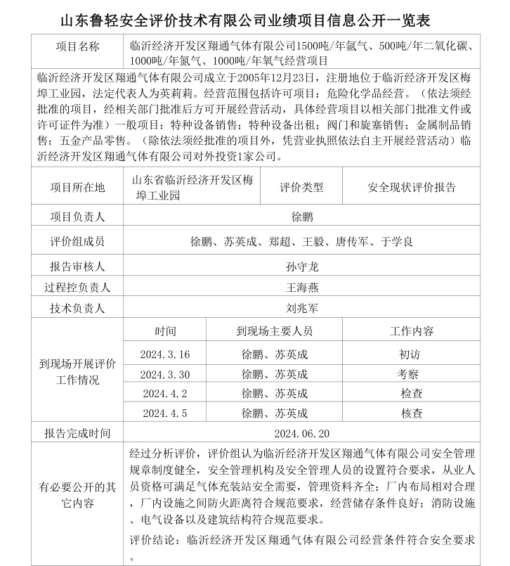 临沂经济开发区翔通气体有限公司1500吨/年氩气、500吨/年二氧化碳、1000吨/年氮气、1000吨/年氧气经营项目