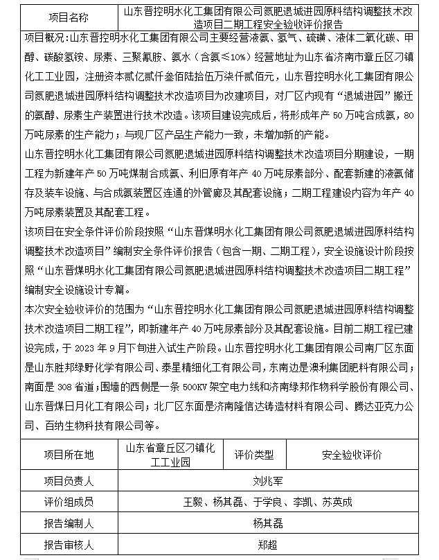 山东晋控明水化工集团有限公司氮肥退城进园原料结构调整技术改造项目二期工程安全验收评价报告