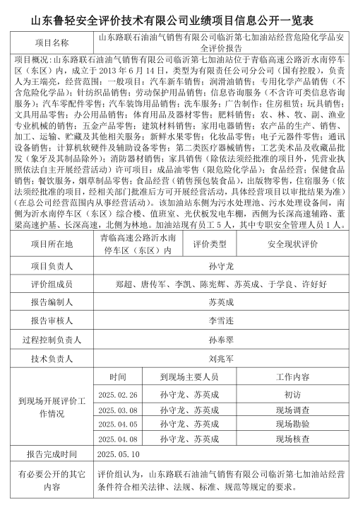 山东路联石油油气销售有限公司临沂第七加油站经营危险化学品安全评价报告