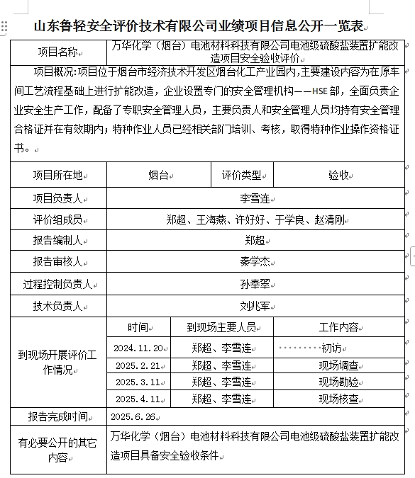 万华化学(烟台)电池材料科技有限公司电池级硫酸盐装置扩能改造项目安全验收评价