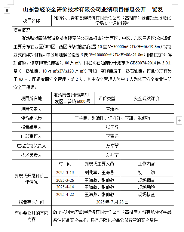 潍坊弘润青滨管道物流有限责任公司(高柳库)仓储经营危险化学品安全评价报告