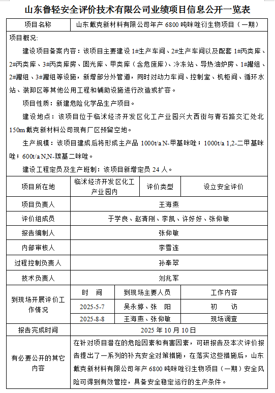 山东戴克新材料有限公司年产6800吨咪唑衍生物项目(一期)