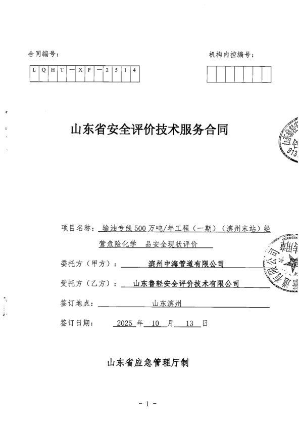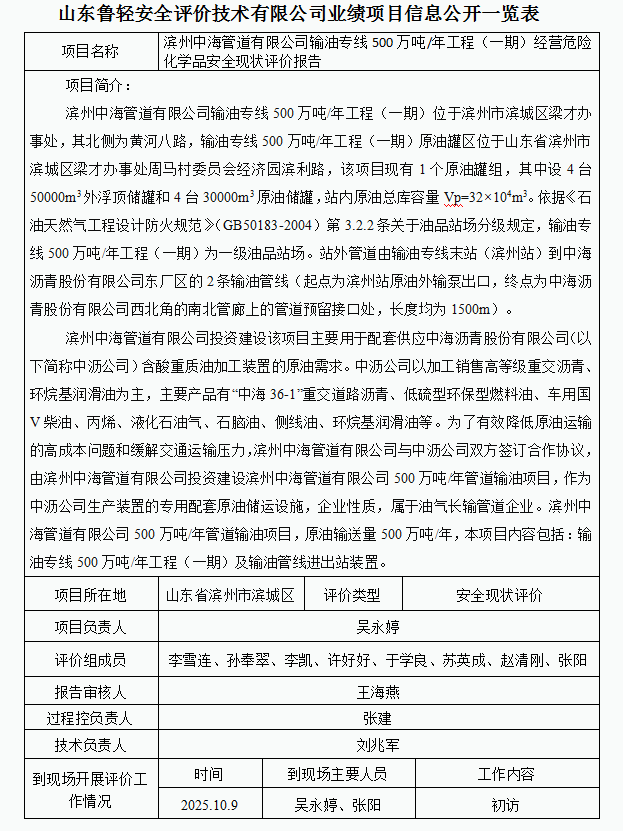 滨州中海管道有限公司输油专线500万吨/年工程(一期)经营危险化学品安全现状评价报告