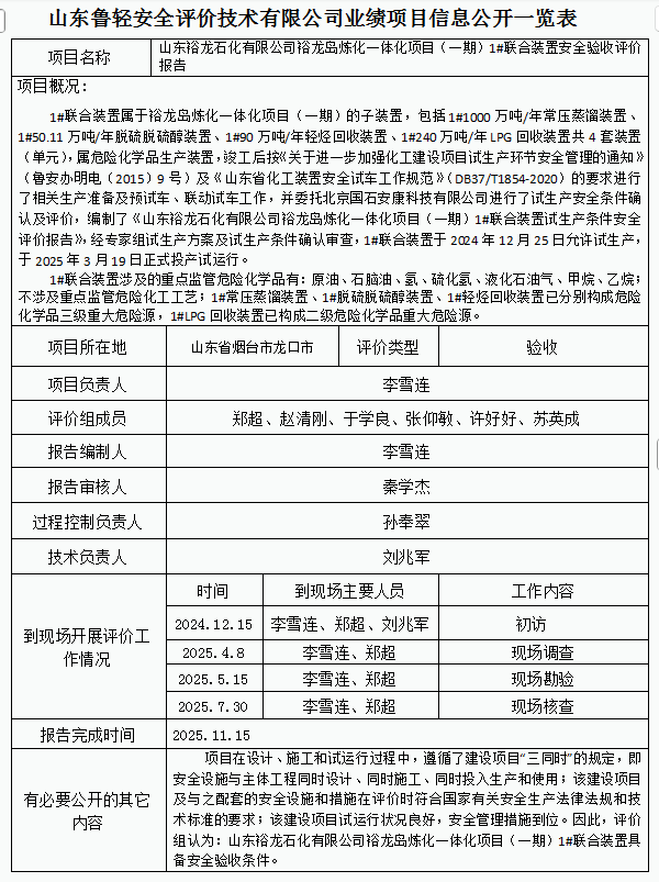 山东裕龙石化有限公司裕龙岛炼化一体化项目(一期)1#联合装置安全验收评价报告