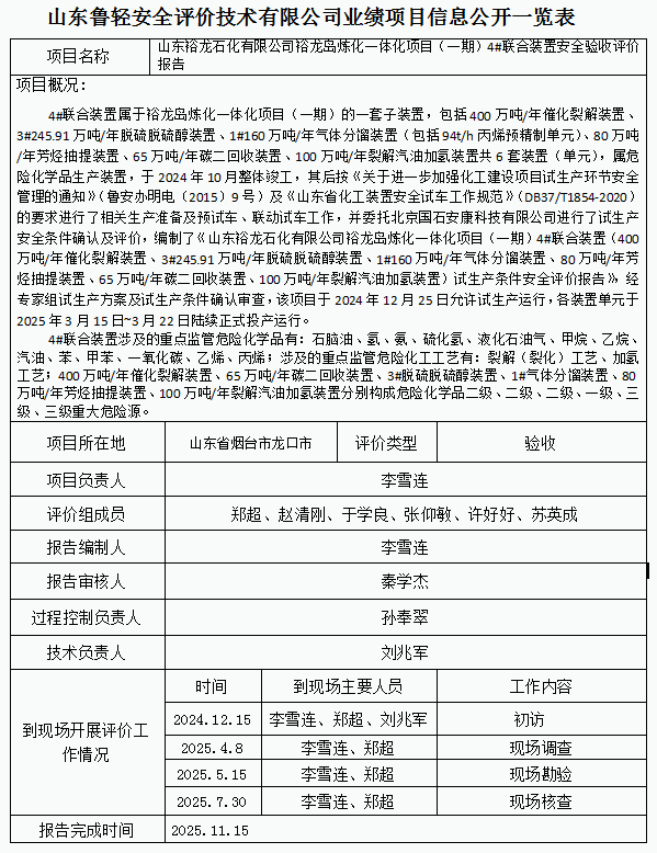 山东裕龙石化有限公司裕龙岛炼化一体化项目(一期)4#联合装置安全验收评价报告