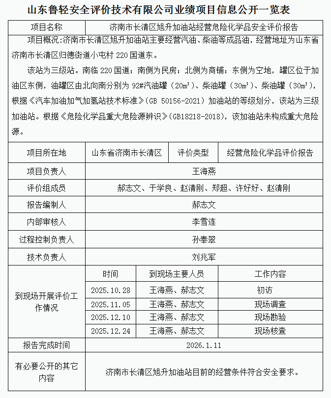 济南市长清区旭升加油站经营危险化学品安全评价报告