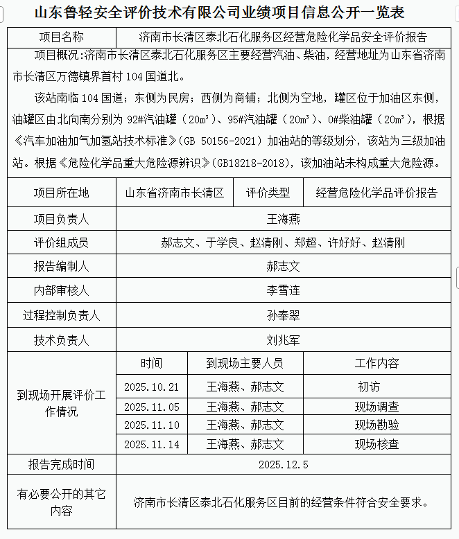 济南市长清区泰北石化服务区经营危险化学品安全评价报告