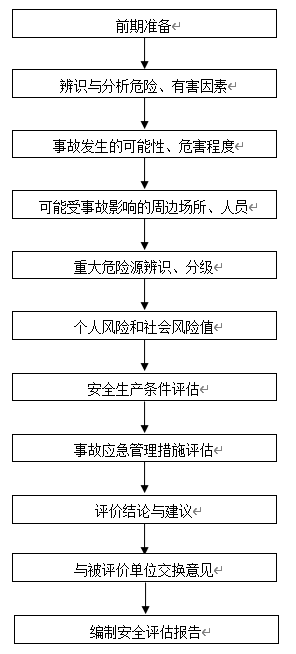 危险化学品重大危险源安全评估的目的是贯彻“安全第一,预防为主,综合治理”的安全生产管理方针,通过对重大危险源实际运行情况的安全评估,对企业重大危险源的安全管理和监控体系的现状进行评估,判断其与相关法律法规、标准规范的符合性,确定重大危险源等级,评估事故应急预案的有效性,实现对重大危险源的分级管理、分级监控,预防重、特大事故的发生,减少企业重大危险源发生事故造成人员伤亡和财产损失。同时安全评估报告也为各级安全生产监督管理部门对重大危险源的监督管理提供重要依据。查找生产运行过程中存在的危险、有害因素并确定危险程度,从而提出合理可行的安全对策措施及建议,并为安全生产监督管理部门依法监督管理提供依据。重大危险源评估的程序框图如下: