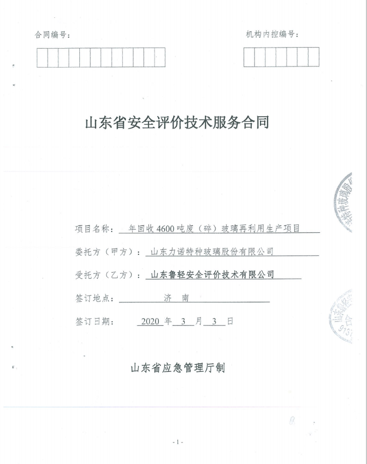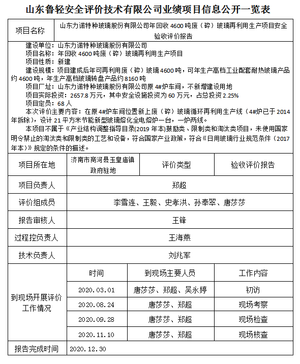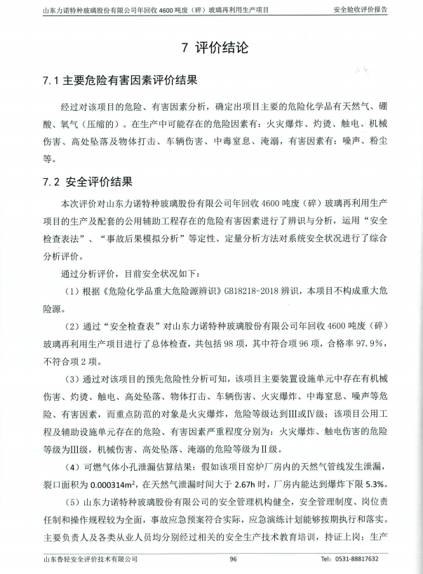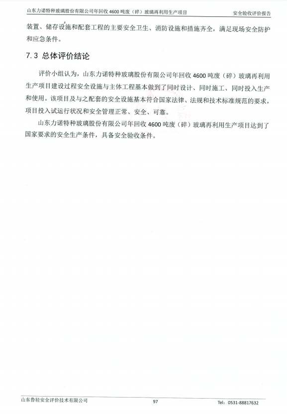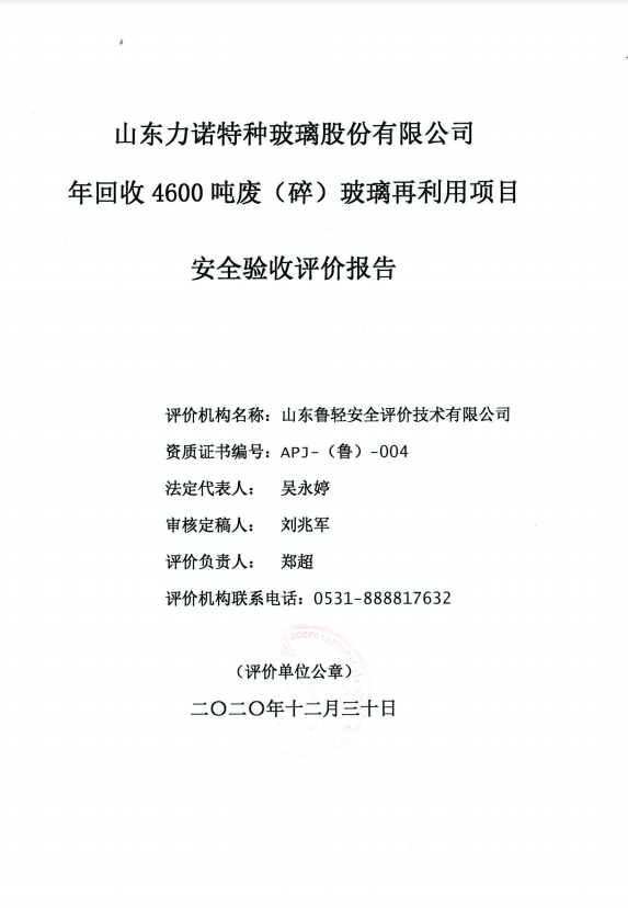 山东力诺特种玻璃股份有限公司年回收4600吨废(碎)玻璃再利用生产项目安全验收评价报告