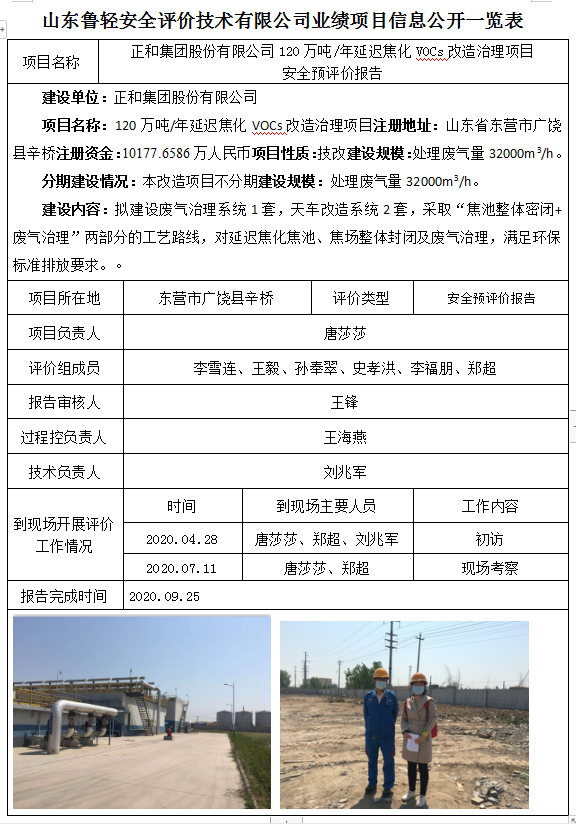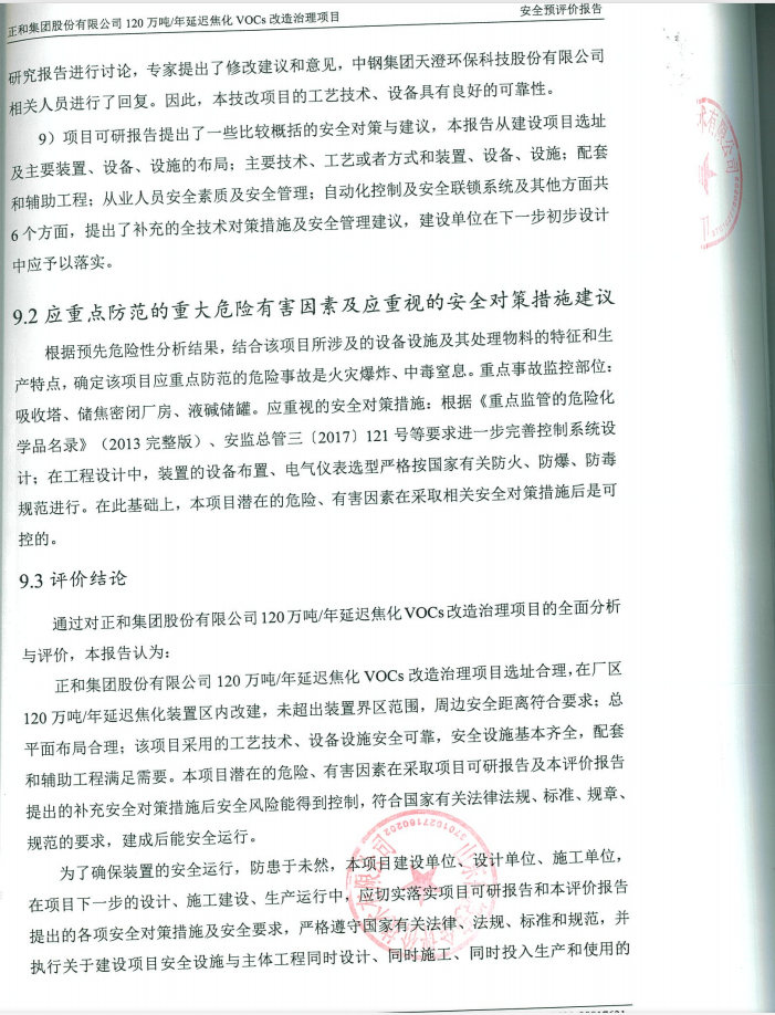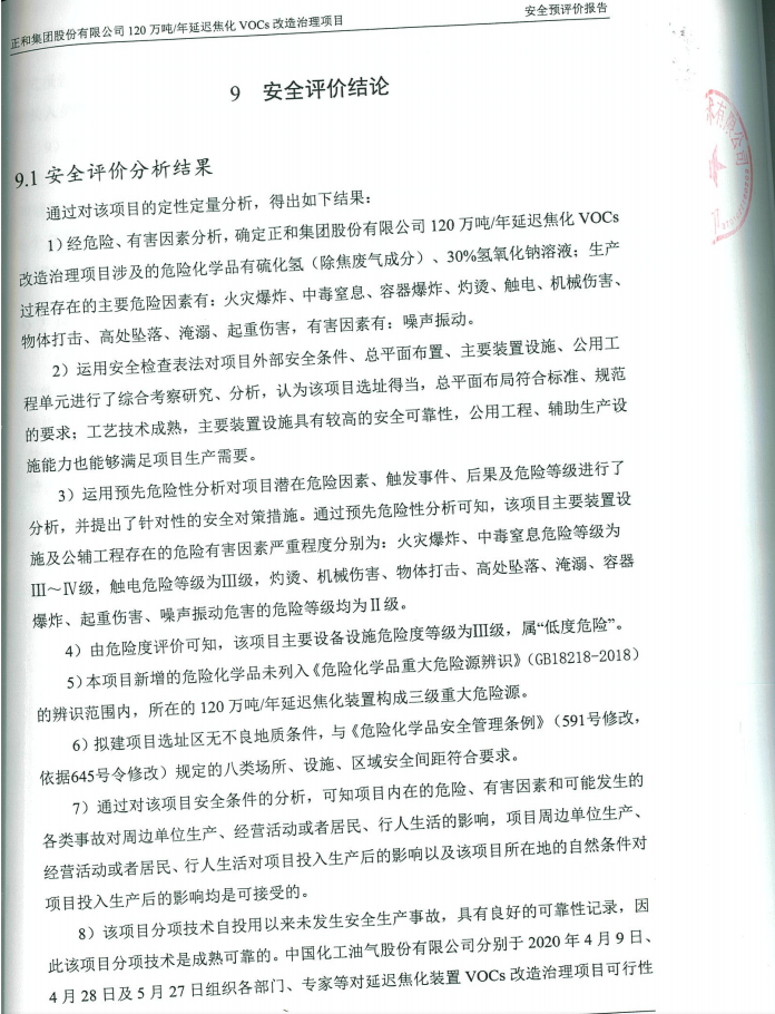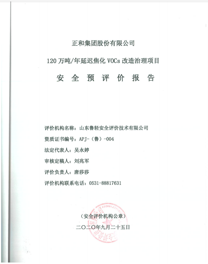 正和集团股份有限公司120万吨/年延迟焦化VOCs改造治理项目安全预评价报告