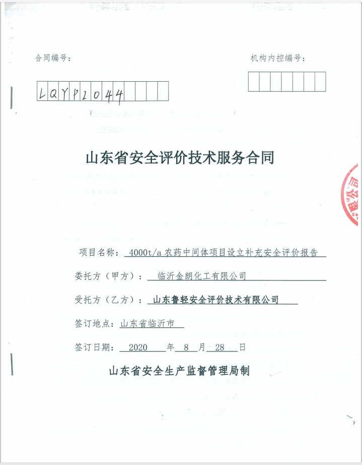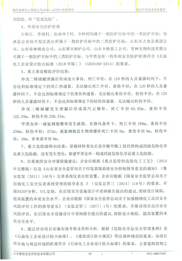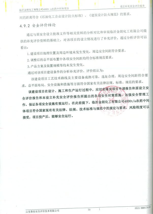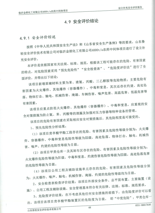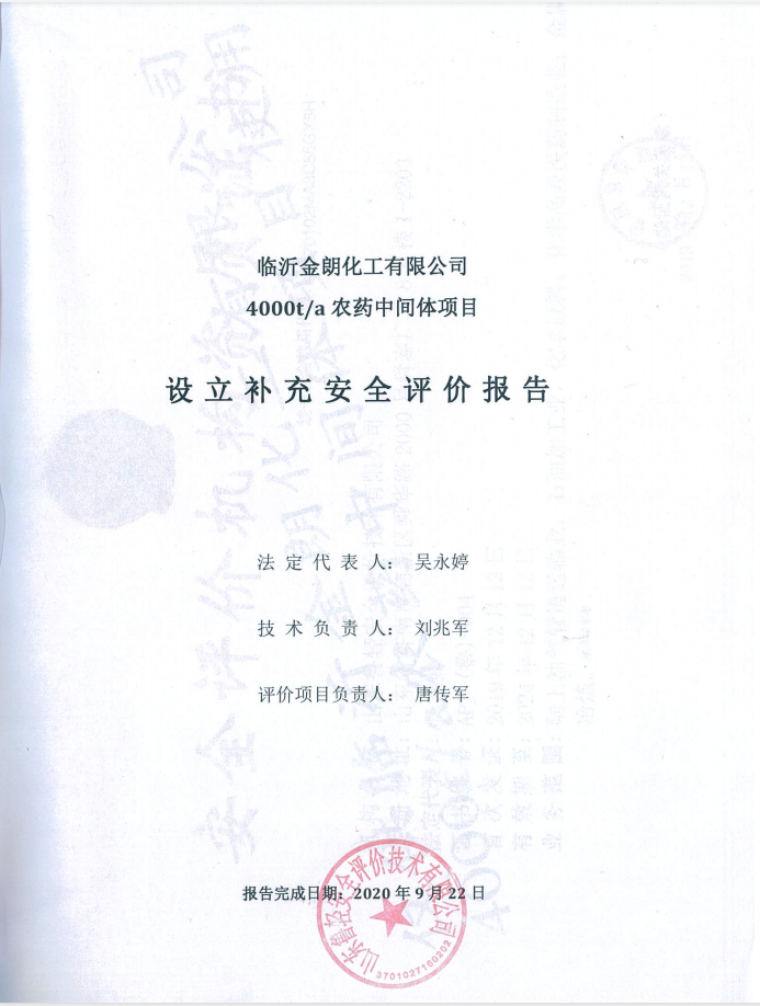 临沂金朗化工有限公司4000t/a农药中间体项目设立补充安全评价报告