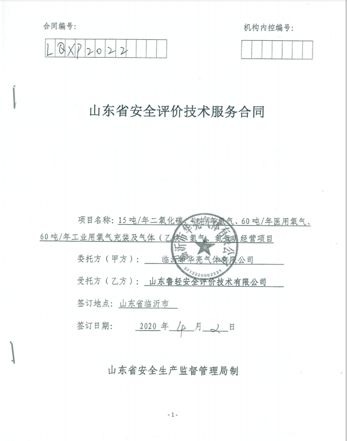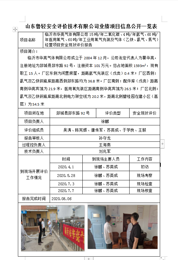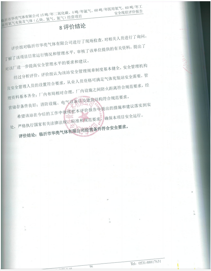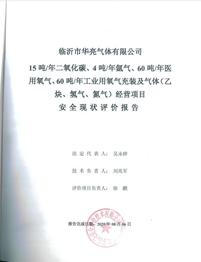 临沂市华亮气体有限公司15吨/年二氧化碳、4吨/年氩气、60吨/年医用氧气、60吨/年工业用氧气充装及气体(乙炔、氢气、氮气)经营项目安全现状评价报告