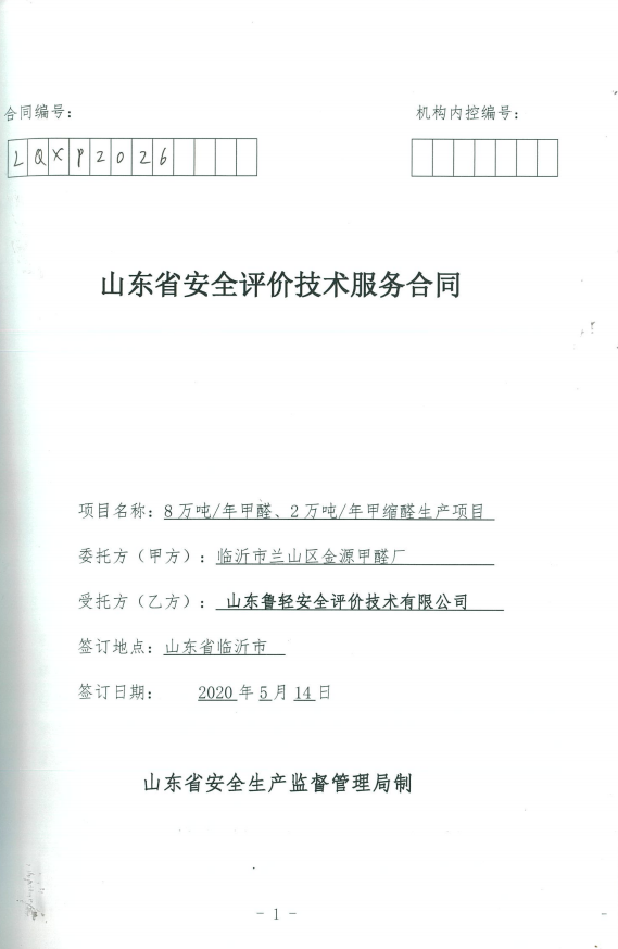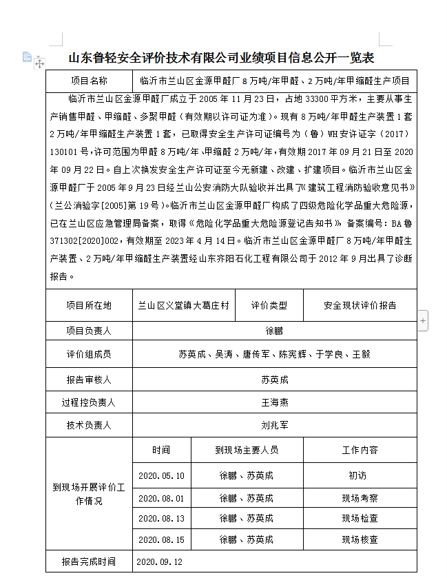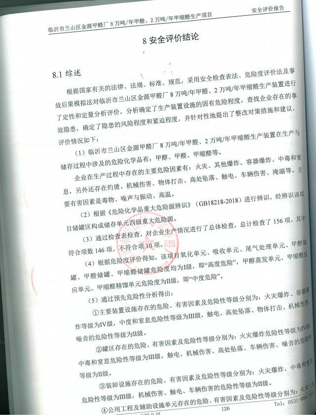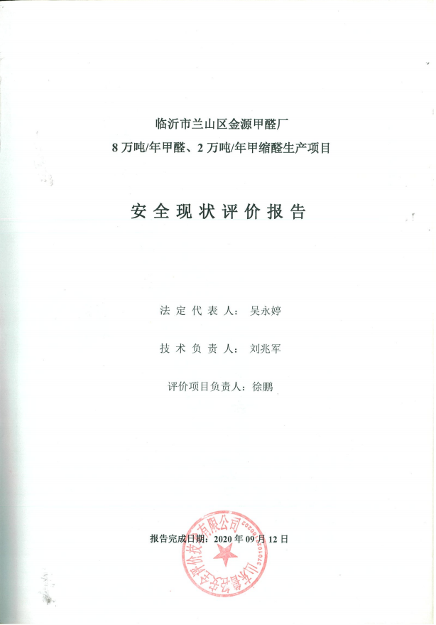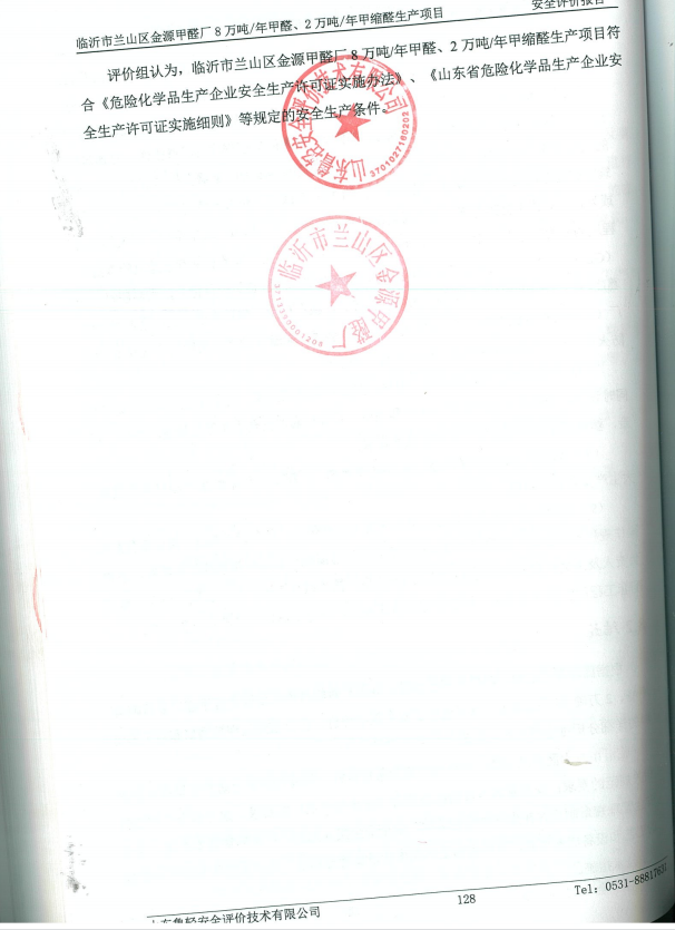 临沂市兰山区金源甲醛厂8万吨/年甲醛、2万吨/年甲缩醛生产项目安全现状评价报告