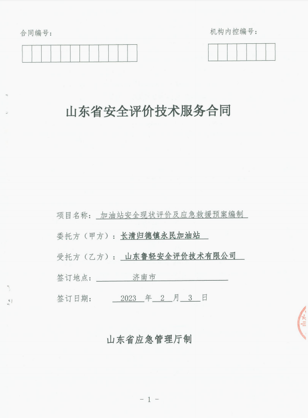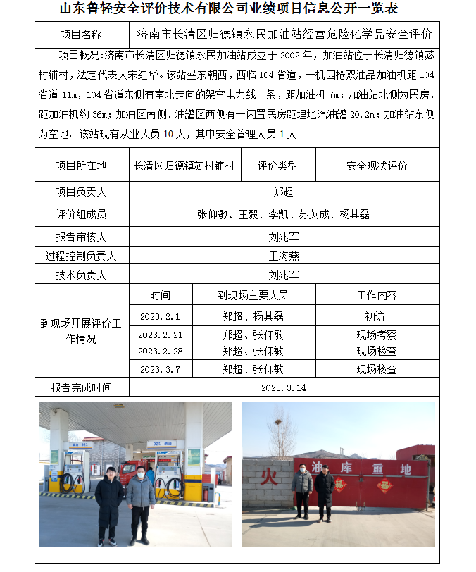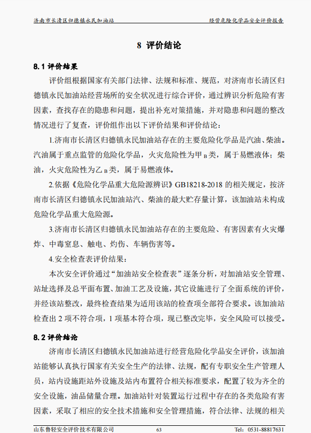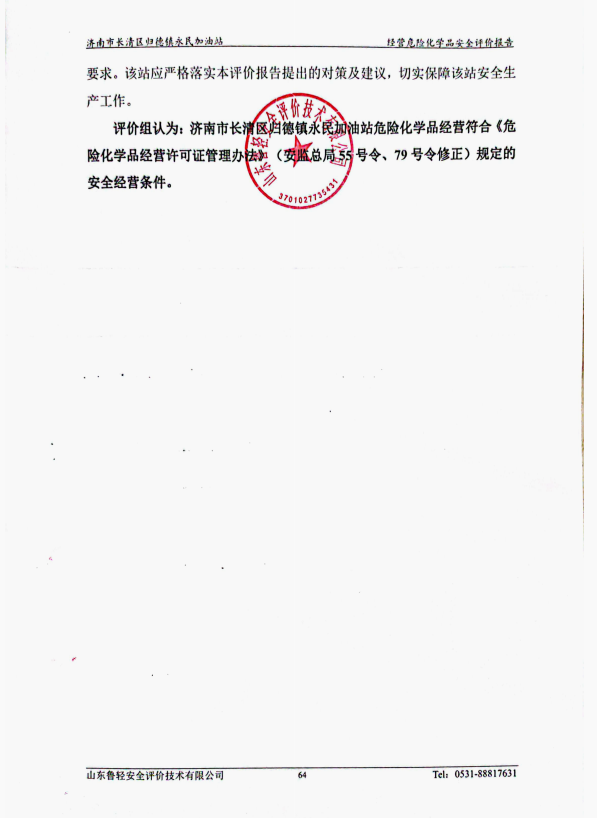 济南市长清区归德镇永民加油站经营危险化学品安全评价