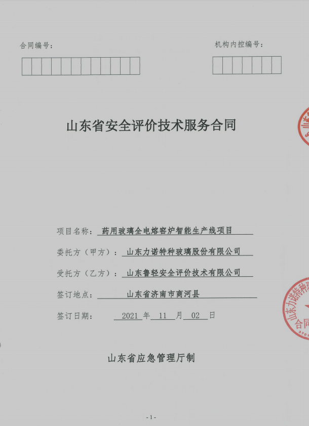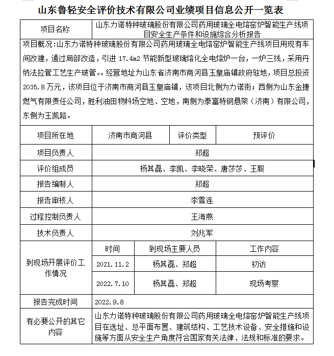 山东力诺特种玻璃股份有限公司药用玻璃全电熔窑炉智能生产线项目安全生产条件和设施综合分析报告