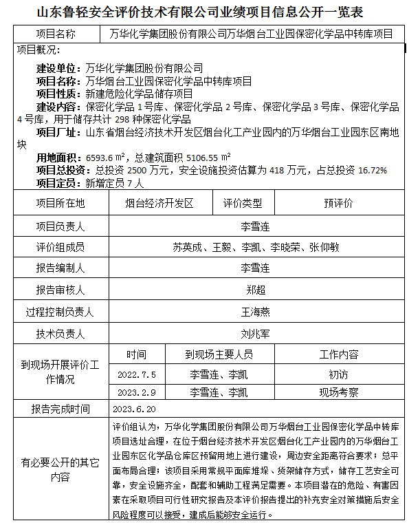 万华化学集团股份有限公司万华烟台工业园保密化学品中转库项目