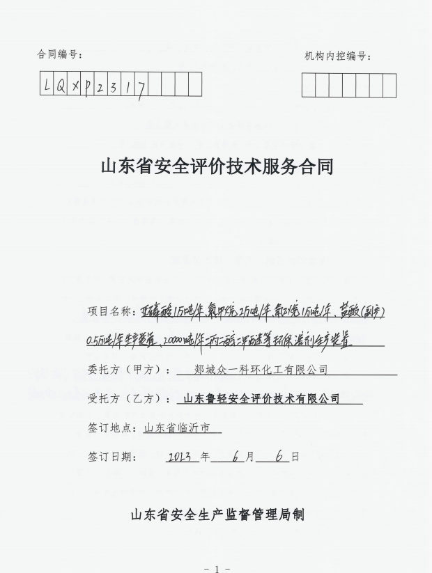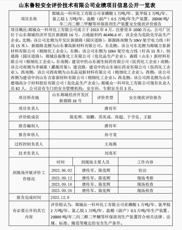 郯城众一科环化工有限公司亚磷酸 1 万吨/年、氯甲烷 2 万吨/年、氯乙烷 1 万吨/年、盐酸(副产)0.5 万吨/年生产装置、20000 吨/年二丙二醇二甲醚等环保溶剂生产装置安全现状评价报告