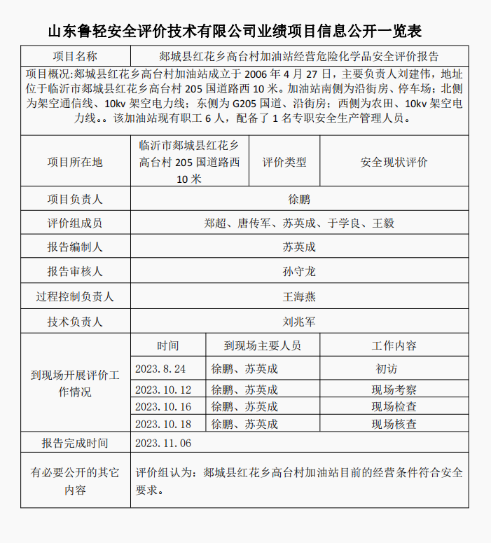 郯城县红花乡高台村加油站经营危险化学品安全评价报告