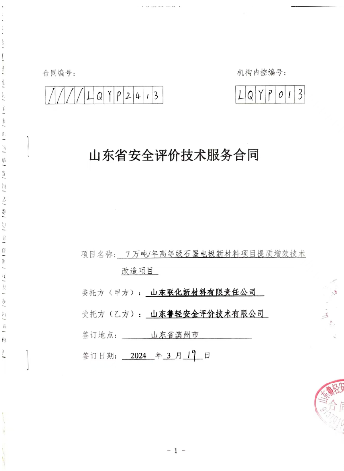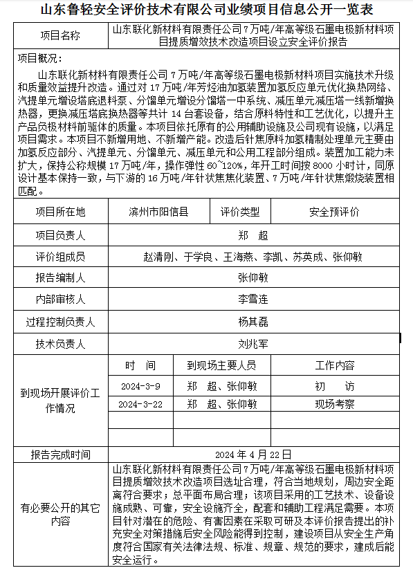 山东联化新材料有限责任公司7万吨/年高等级石墨电极新材料项目提质增效技术改造项目设立安全评价报告
