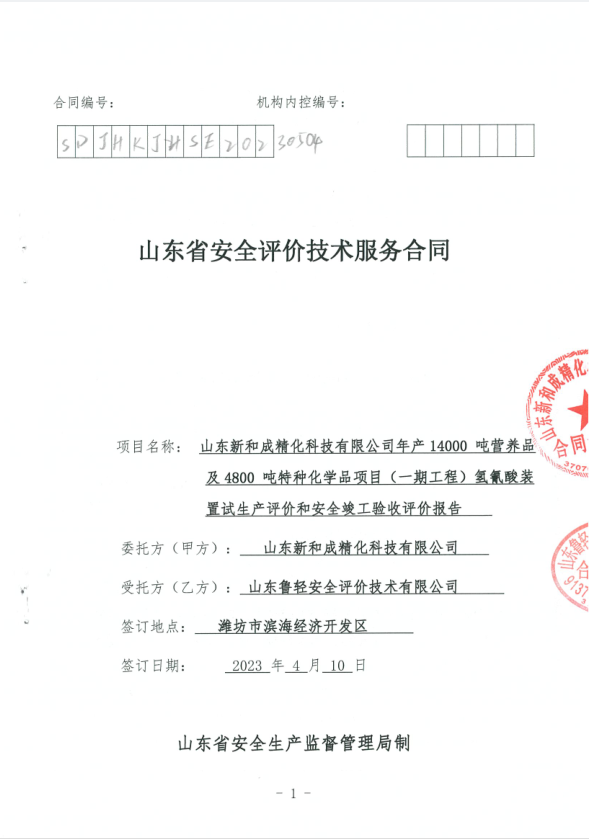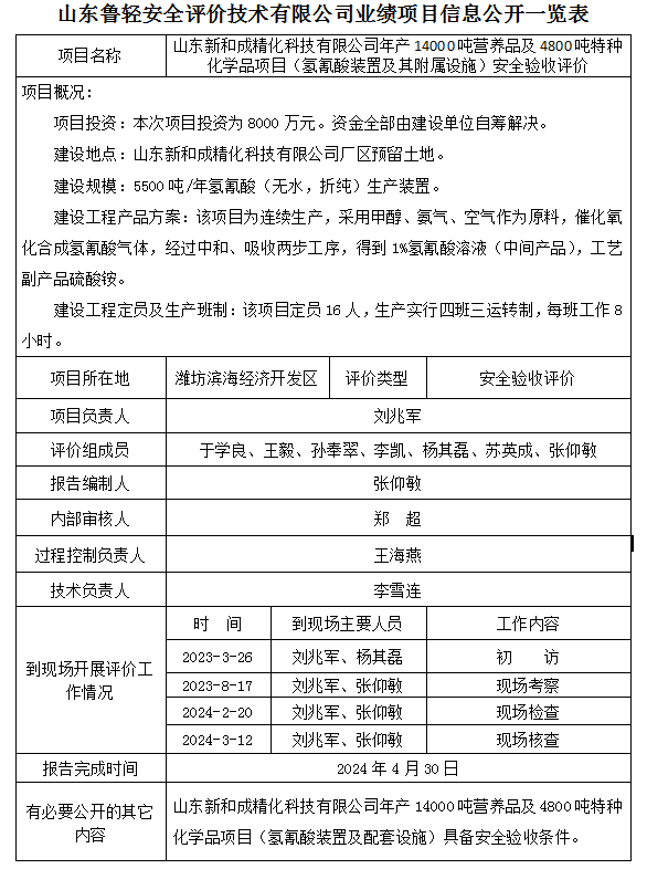 山东新和成精化科技有限公司年产14000吨营养品及4800吨特种化学品项目(氢氰酸装置及其附属设施)安全验收评价