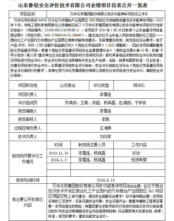 万华化学集团股份有限公司多功能单体项目设立评价
