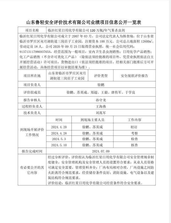 临沂红星日用化学有限公司 120 万瓶/年气雾杀虫剂安全现状评价报告