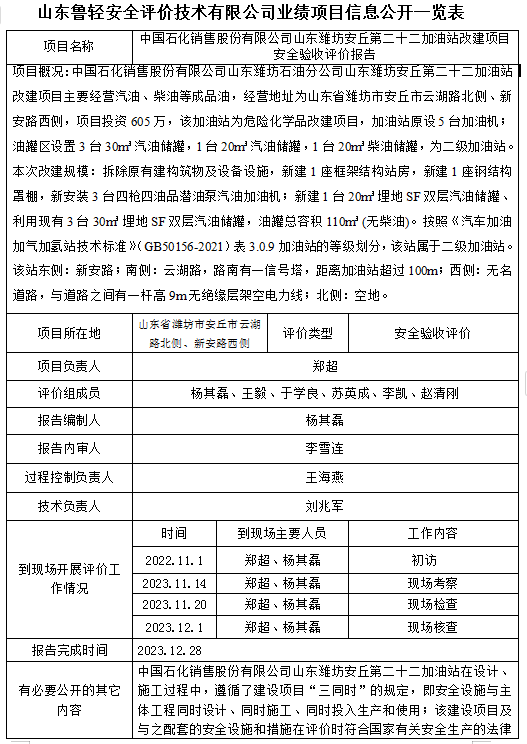 中国石化销售股份有限公司山东潍坊安丘第二十二加油站改建项目安全验收评价报告