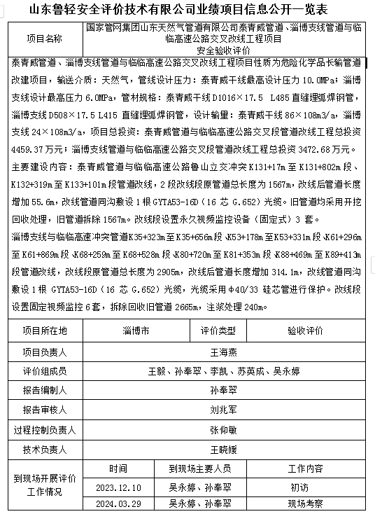 国家管网集团山东天然气管道有限公司泰青威管道、淄博支线管道与临临高速公路交叉改线工程项目安全验收评价