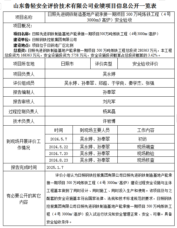 日照先进钢铁制造基地产能承接一期项目500万吨炼铁工程(4号3000m3高炉)安全验收