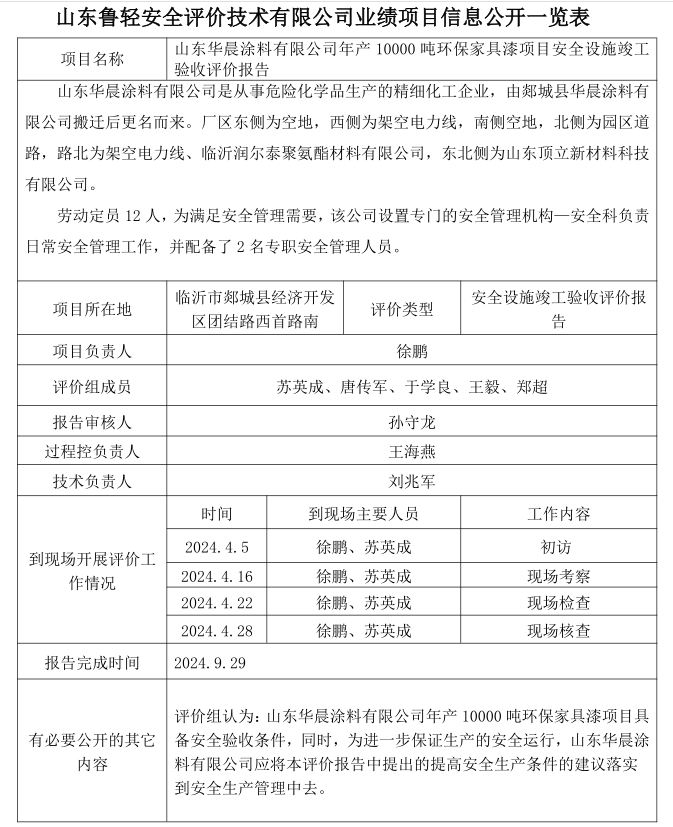 山东华晨涂料有限公司年产 10000 吨环保家具漆项目安全设施竣工验收评价报告