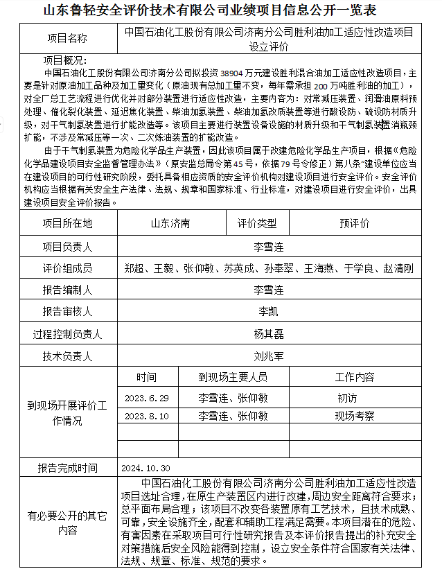 中国石油化工股份有限公司济南分公司胜利油加工适应性改造项目设立评价