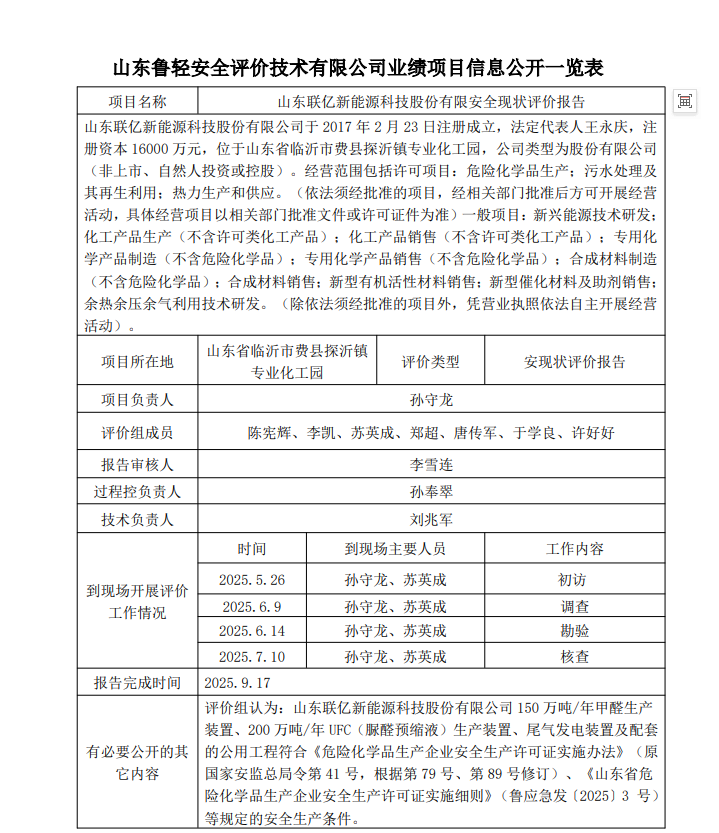 山东联亿新能源科技股份有限安全现状评价报告