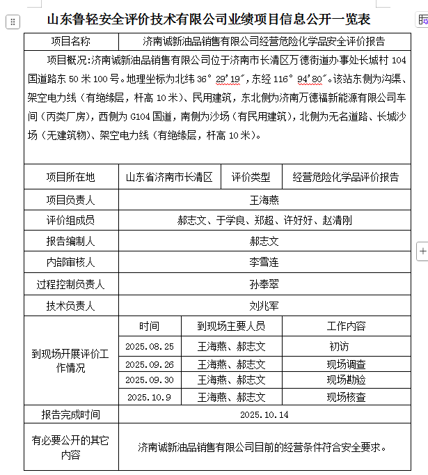 济南诚新油品销售有限公司经营危险化学品安全评价报告