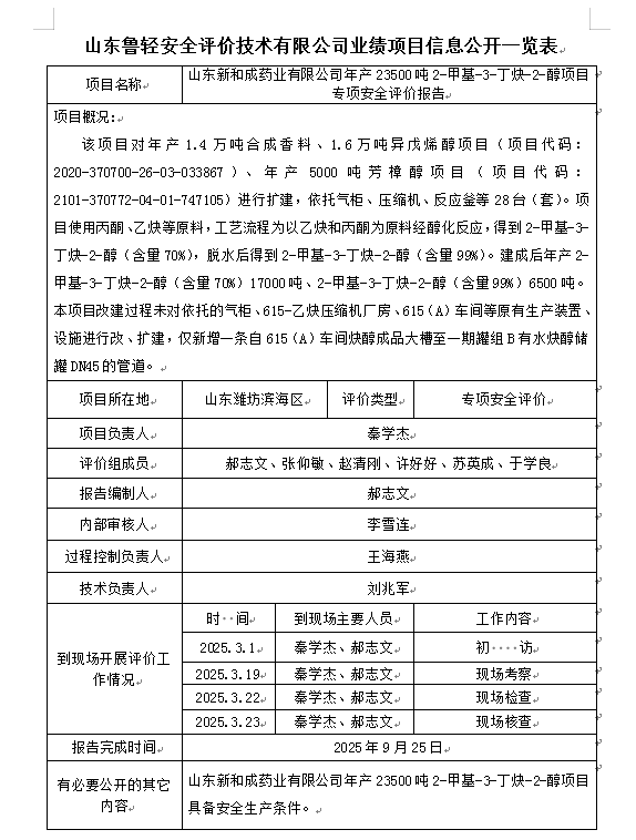 山东新和成药业有限公司年产 23500 吨 2-甲基-3-丁炔-2-醇项目专项安全评价报告