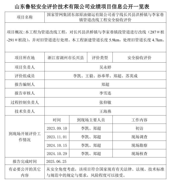 国家管网集团东部原油储运有限公司甬宁线长兴县洪桥镇与李家巷镇管道改线工程安全验收评价