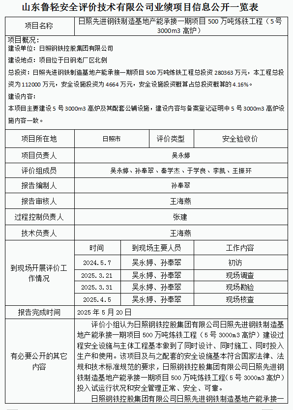 日照先进钢铁制造基地产能承接一期项目500万吨炼铁工程(5号3000m3高炉)