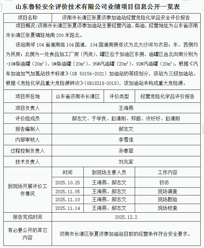济南市长清区张夏济泰加油站经营危险化学品安全评价报告