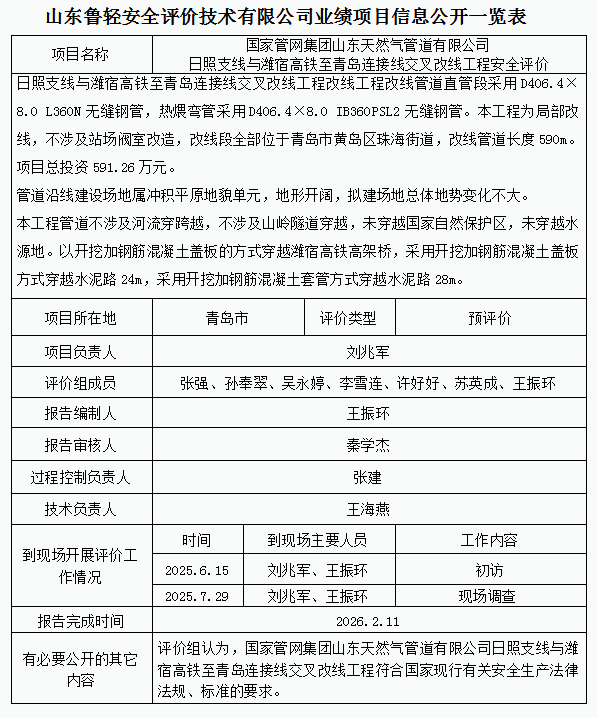 国家管网集团山东天然气管道有限公司日照支线与潍宿高铁至青岛连接线交叉改线工程安全评价