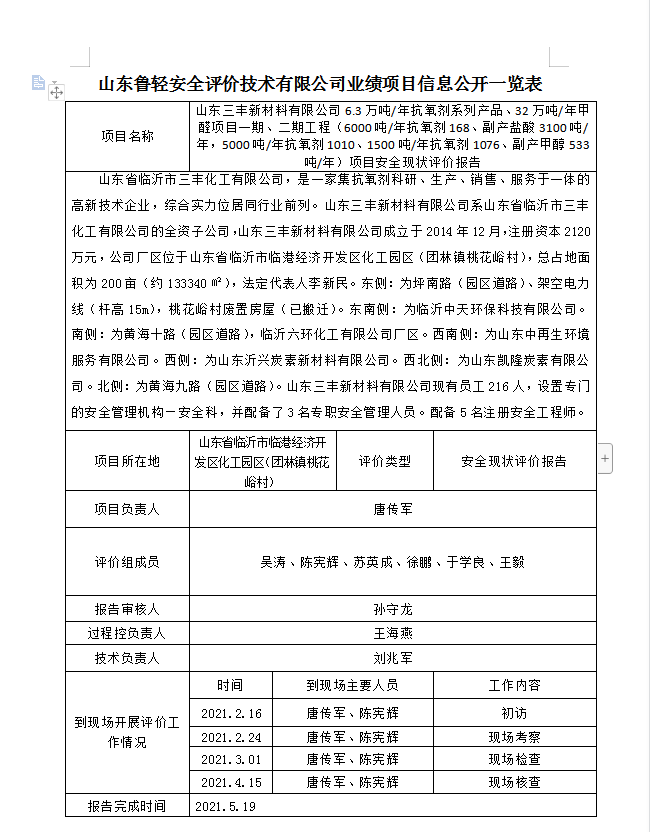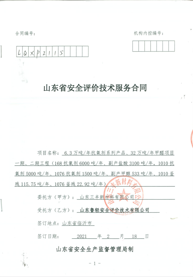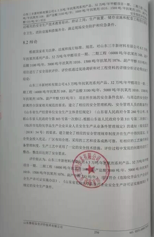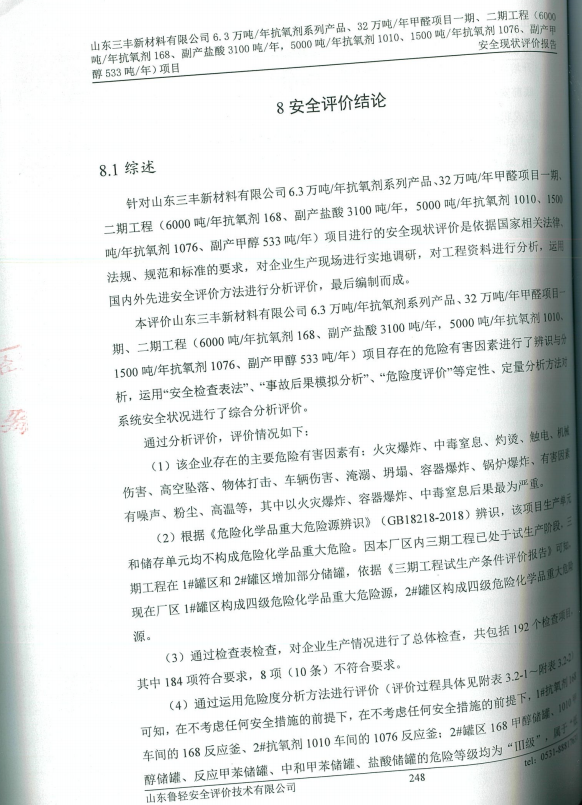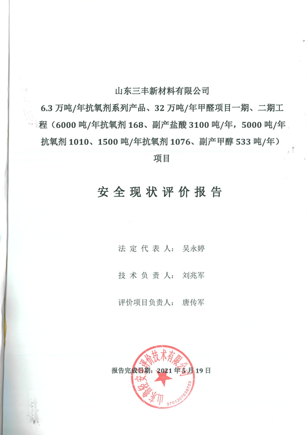 山东三丰新材料有限公司6.3万吨/年抗氧剂系列产品、32万吨/年甲醛项目一期、二期工程项目安全现状评价报告