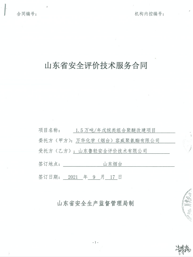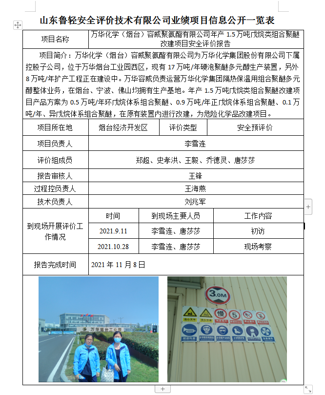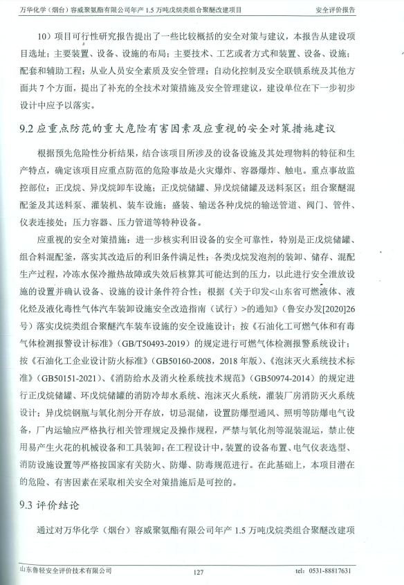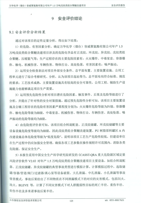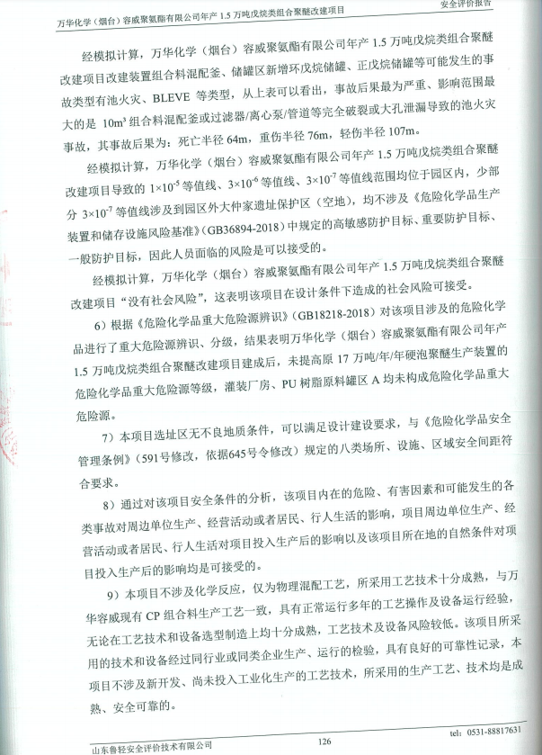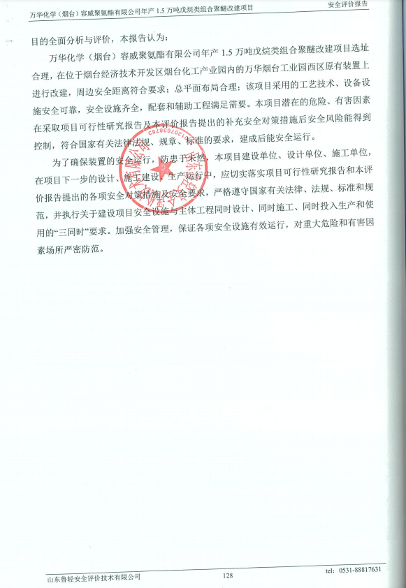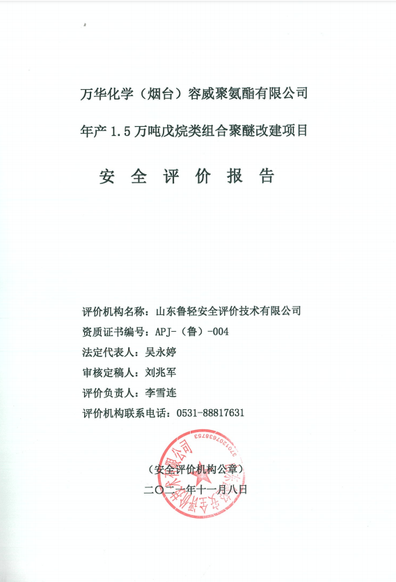 万华化学(烟台)容威聚氨酯有限公司年产1.5万吨戊烷类组合聚醚改建项目安全评价报告