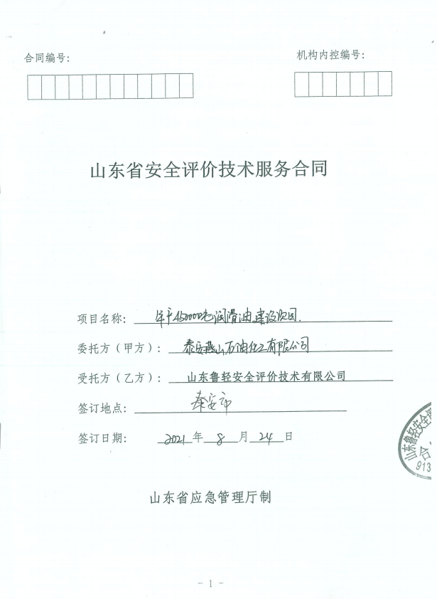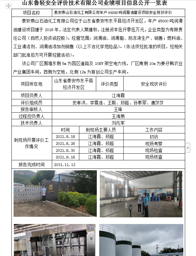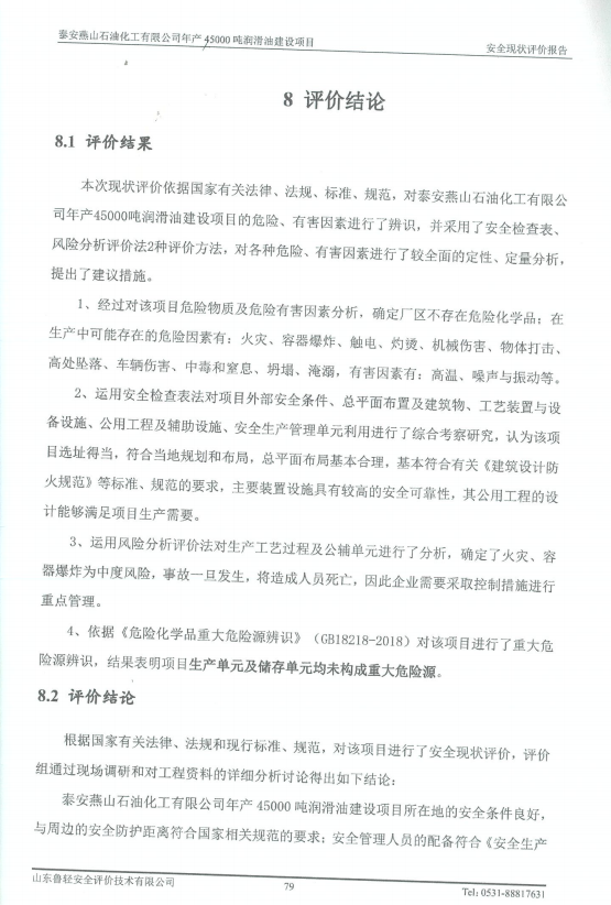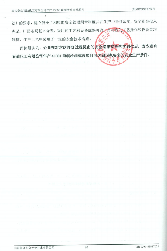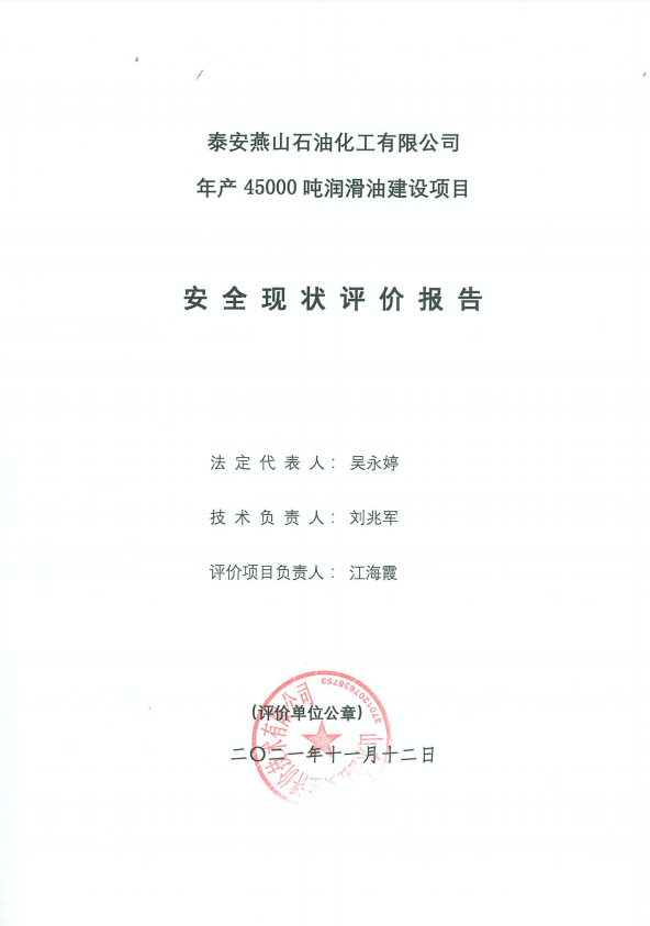 泰安燕山石油化工有限公司年产45000吨润滑油建设项目安全现状评价
