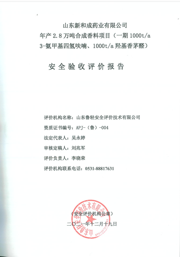 山东新和成药业有限公司年产2.8万吨合成香料项目(一期1000t/a 3-氨甲基四氢呋喃、1000t/a羟基香茅醛)