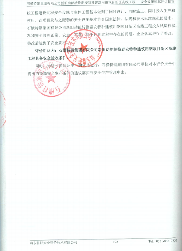 石横特钢集团有限公司新旧动能转换泰安特种建筑用钢项目高线工程安全设施验收评价报告
