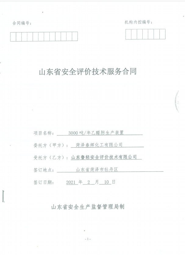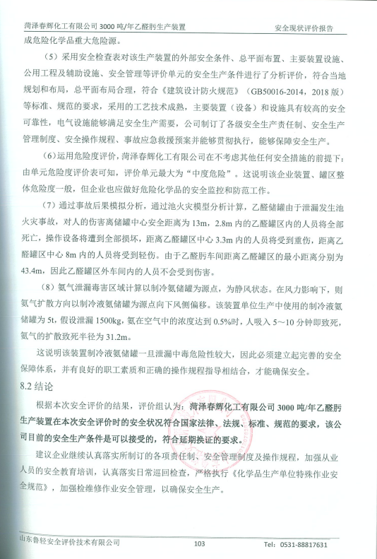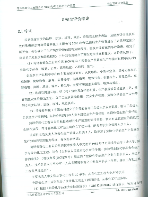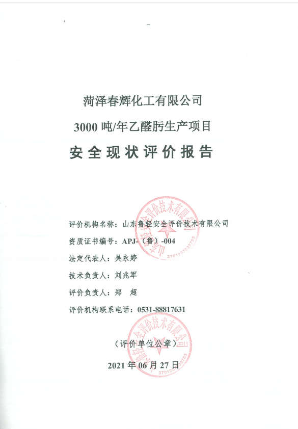 菏泽春辉化工有限公司3000吨/年乙醛肟生产装置安全现状评价报告