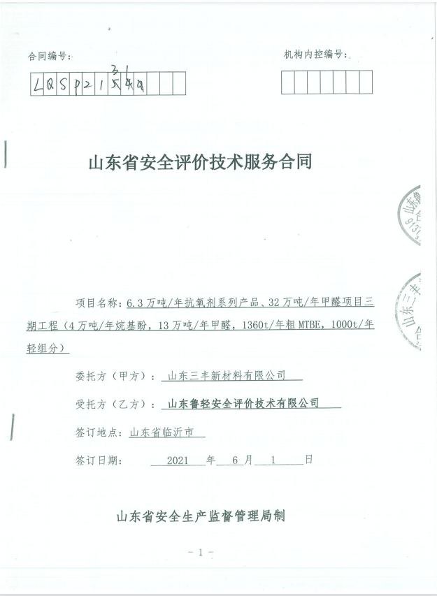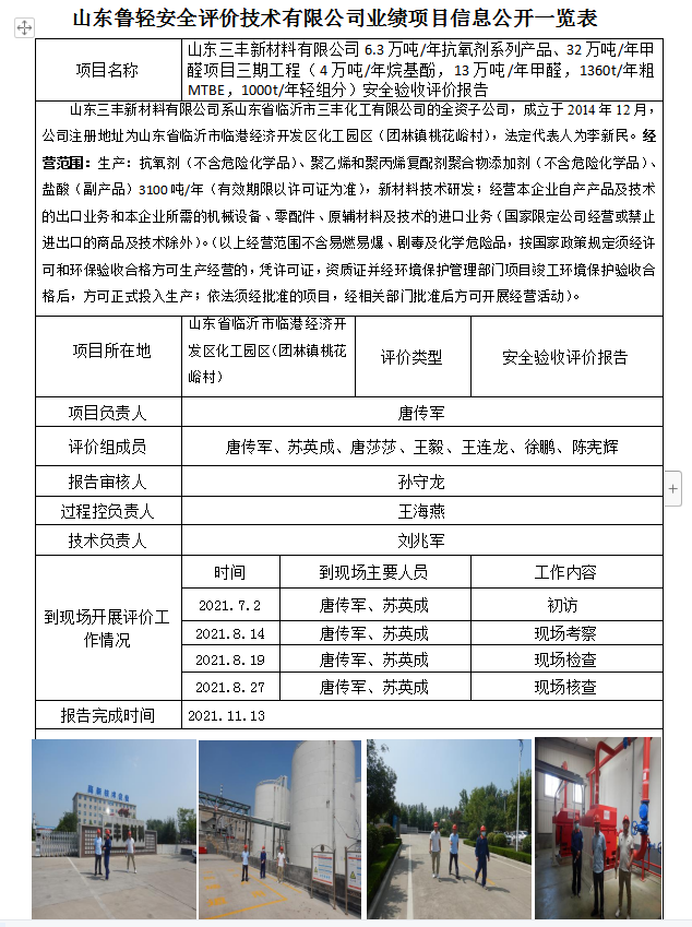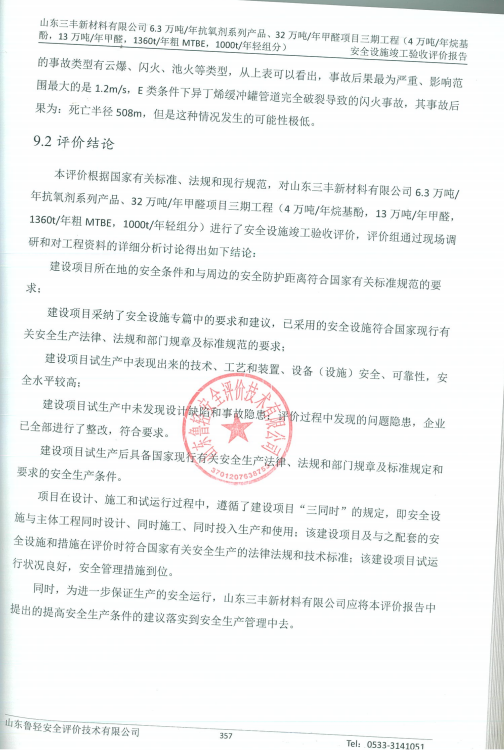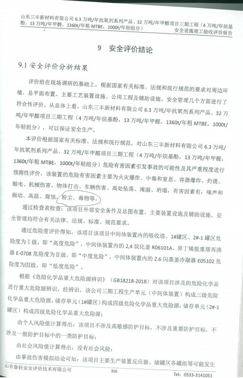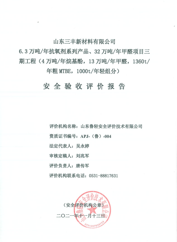 山东三丰新材料有限公司6.3万吨/年抗氧剂系列产品、32万吨/年甲醛项目三期工程(4万吨/年烷基酚,13万吨/年甲醛,1360t/年粗MTBE,1000t/年轻组分)安全验收评价报告